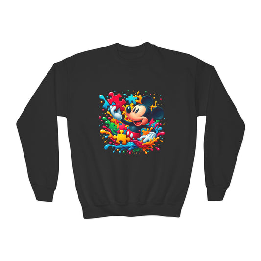 Colorful Puzzle Autism Awareness Youth Crewneck Sweatshirt - Mickey Mouse Design